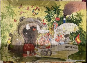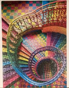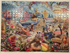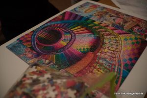 Am Tisch daneben geht es weniger beschwingt zu? „Boah, wo hast Du denn DAS Puzzle aufgetrieben?“ fragt eine der Frauen, die anderen drei starren auf die Restteile des Rundpuzzles, das den schönen Titel „My little world – Gravity“ trägt.