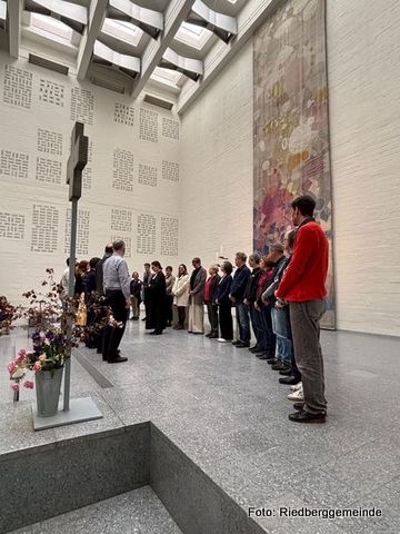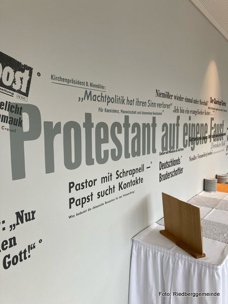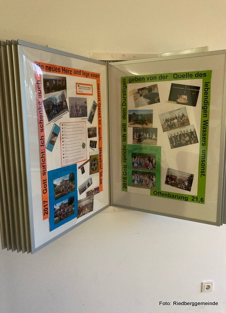 Im Kirchenhaus gibt es was Neues. Wir haben einen Blätter-Ständer für unsere Jahresplakate. Da kann man sich jetzt durch 20 Jahre Riedberggemeinde blättern.