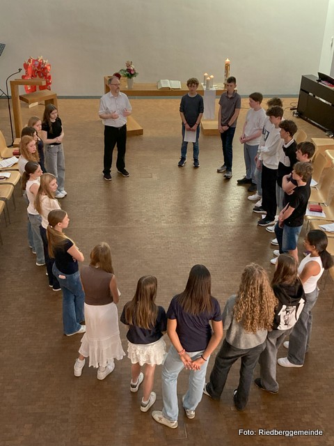 Gut 40 Jugendliche werden in diesem Jahr am Riedberg konfirmiert. In zwei Gruppen geteilt haben sie zwei Vorstellungsgottesdienste gestaltet und am 11. Mai gehalten. Hier Gruppe zwei im Konzentrationsmodus kurz vor dem Godi.